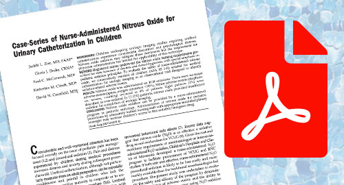 - Zier JL, Drake GJ, McCormick PC, Clinch KM, Cornfield DN. Case-series of nurse-administered nitrous oxide for urinary catheterization in children. Anesth Analg. 2007 Apr;104(4):876-9. doi: 10.1213/01.ane.0000258763.17768.ce. PMID: 17377099.